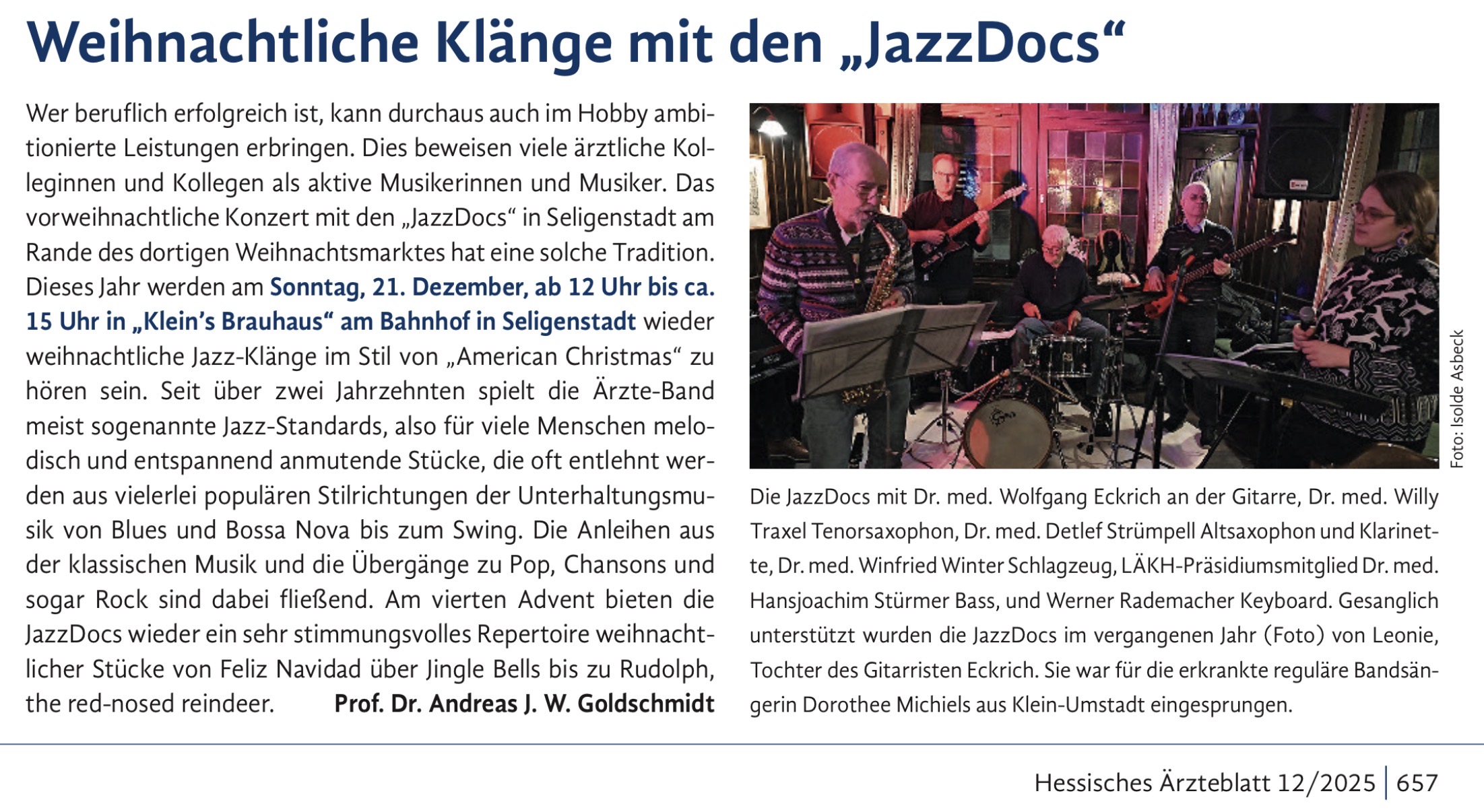 Am 9.9.2014 wurden die „gmds Allstars" der Fachgesellschaft GMDS im Rathaus in Göttingen in's Leben gerufen, die jährlich einen Auftritt bestreiten soll. "Wir hatten noch nie miteinander gespielt/geprobt, es war also alles eine völlig spontan Musik“verrückte Professoren“-Aktion, die natürlich immer gut ankommt. Die Stimmung war jedenfalls sehr gut, das Musizieren und Mitsingen hat allen MitsingerInnen und TänzerInnen offensichtlich großen Spaß gemacht. Und darauf kommt es m. E. wirklich an." <Andreas Goldschmidt>
