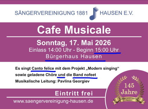 nofeet feiert mit beim Cafe Musicale zu 145 Jahre Sängervereinigung Hausen: Im Bürgerhaus Obertshausen (Hausen) am So., 17. Mai 2026, und begleitet u. a. einige Stücke des "Modern Singing"-Projektes des Frauenchors Canto Felice.